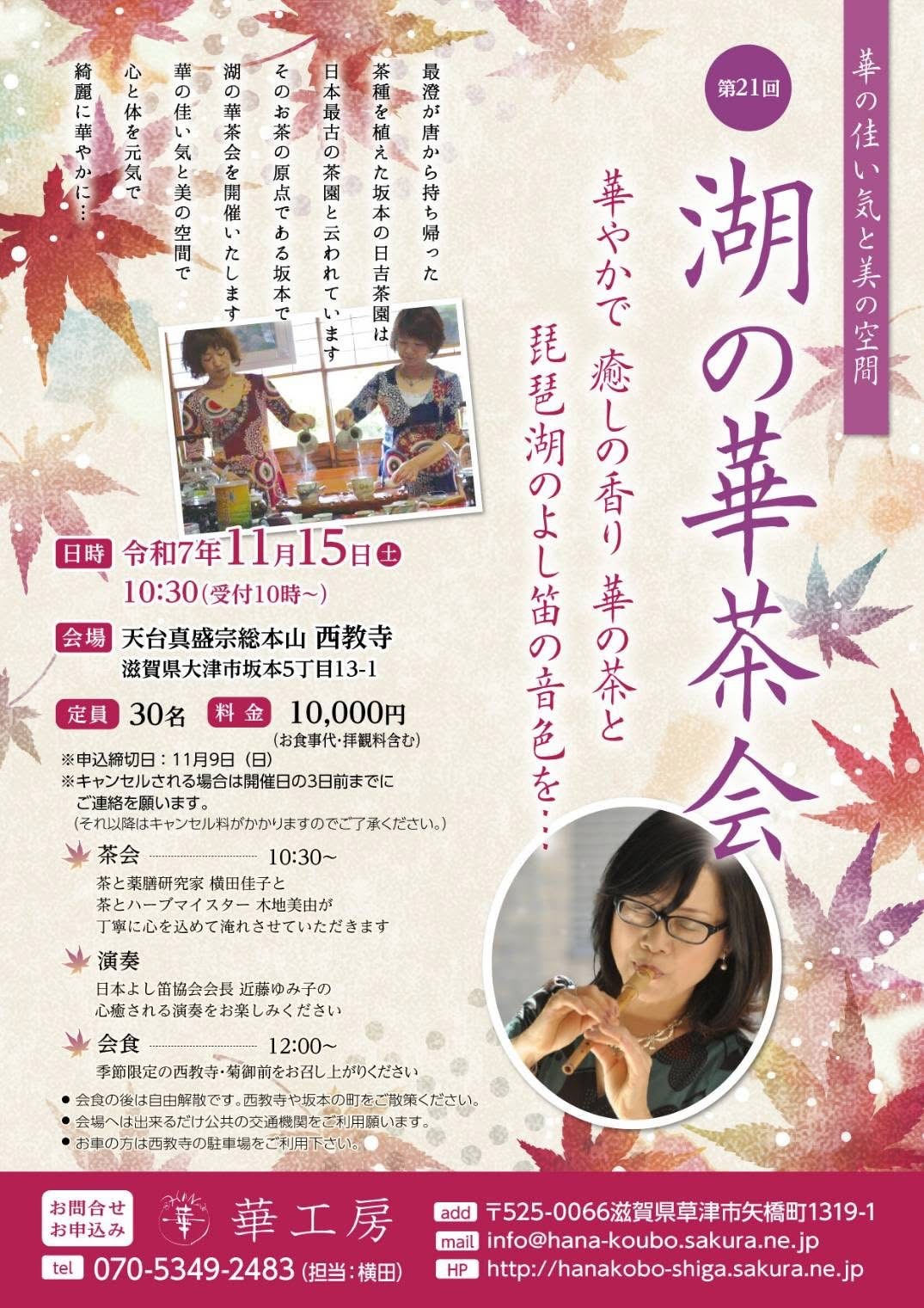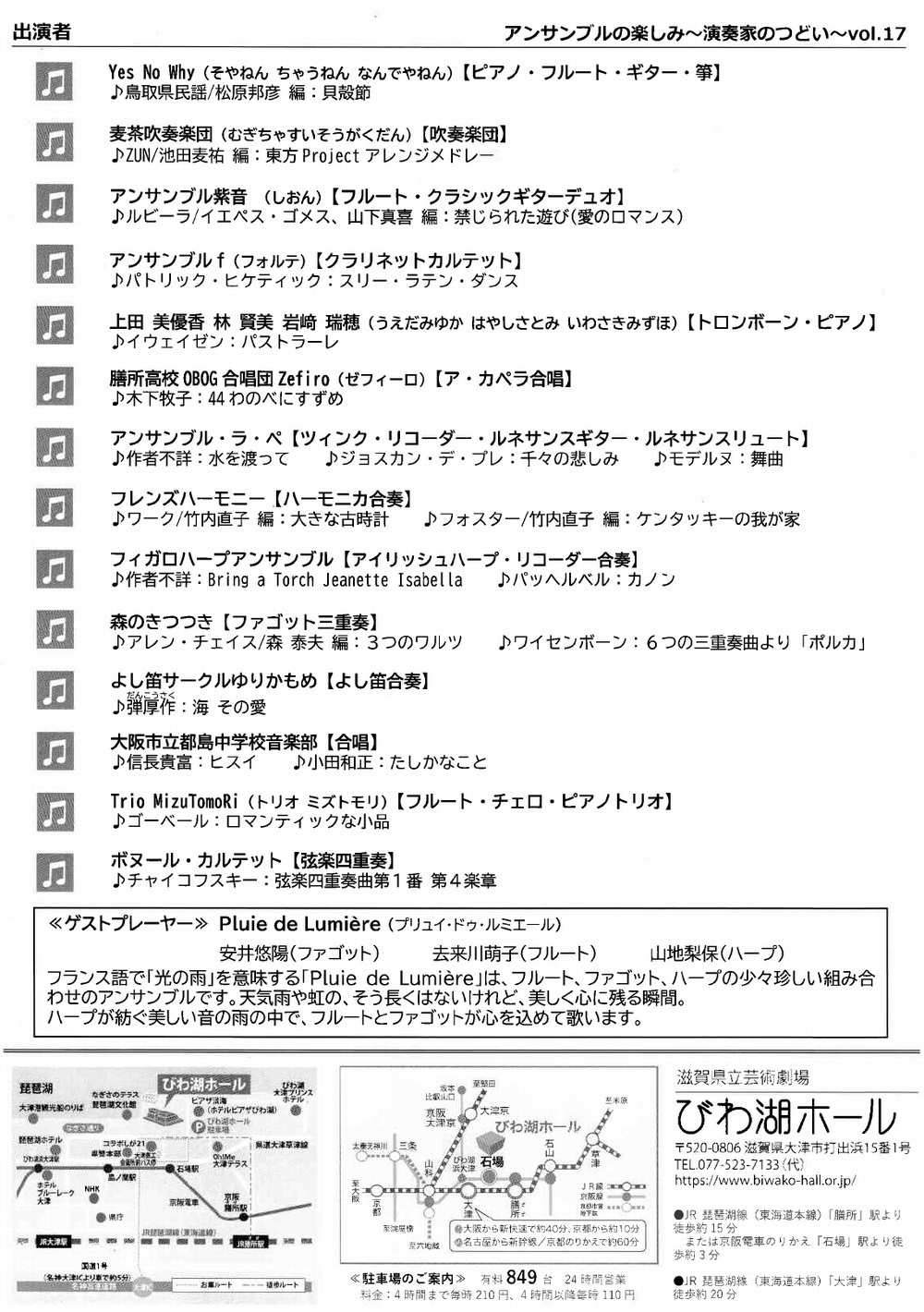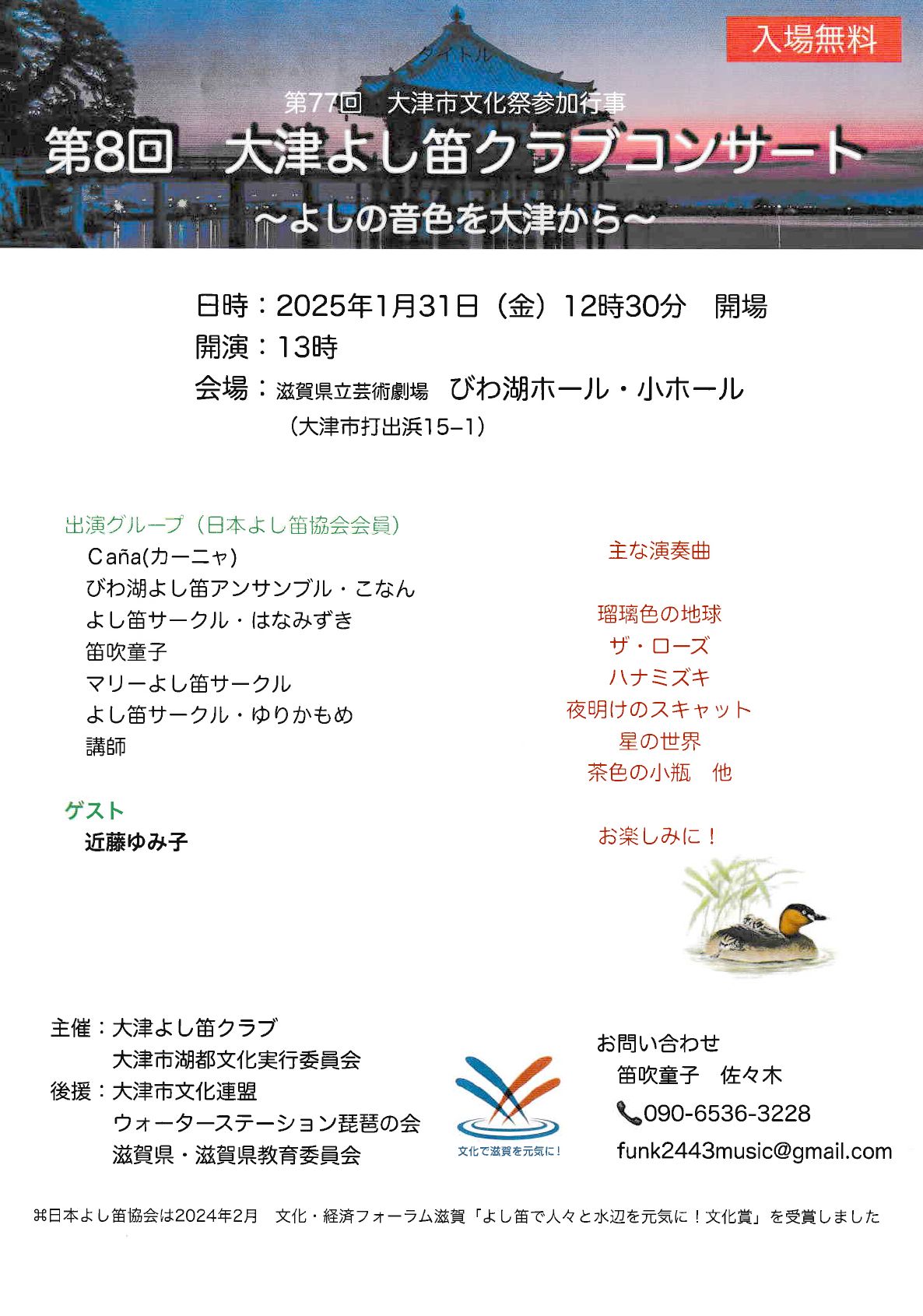 1月31日(金) 13時〜 | 会場:滋賀県立芸術劇場びわ湖ホール・小ホール (入場無料) 〔 地図 〕 日本よし笛協会加盟で大津市に活動拠点を置く6グループと講師、そしてゲストによる“琵琶湖よし笛”のコンサートが開催されます。 詳細はチラシ画像をクリックしてご確認ください |