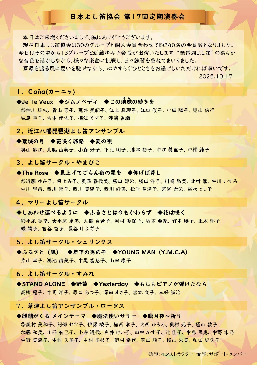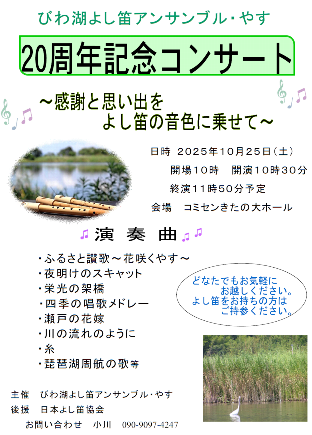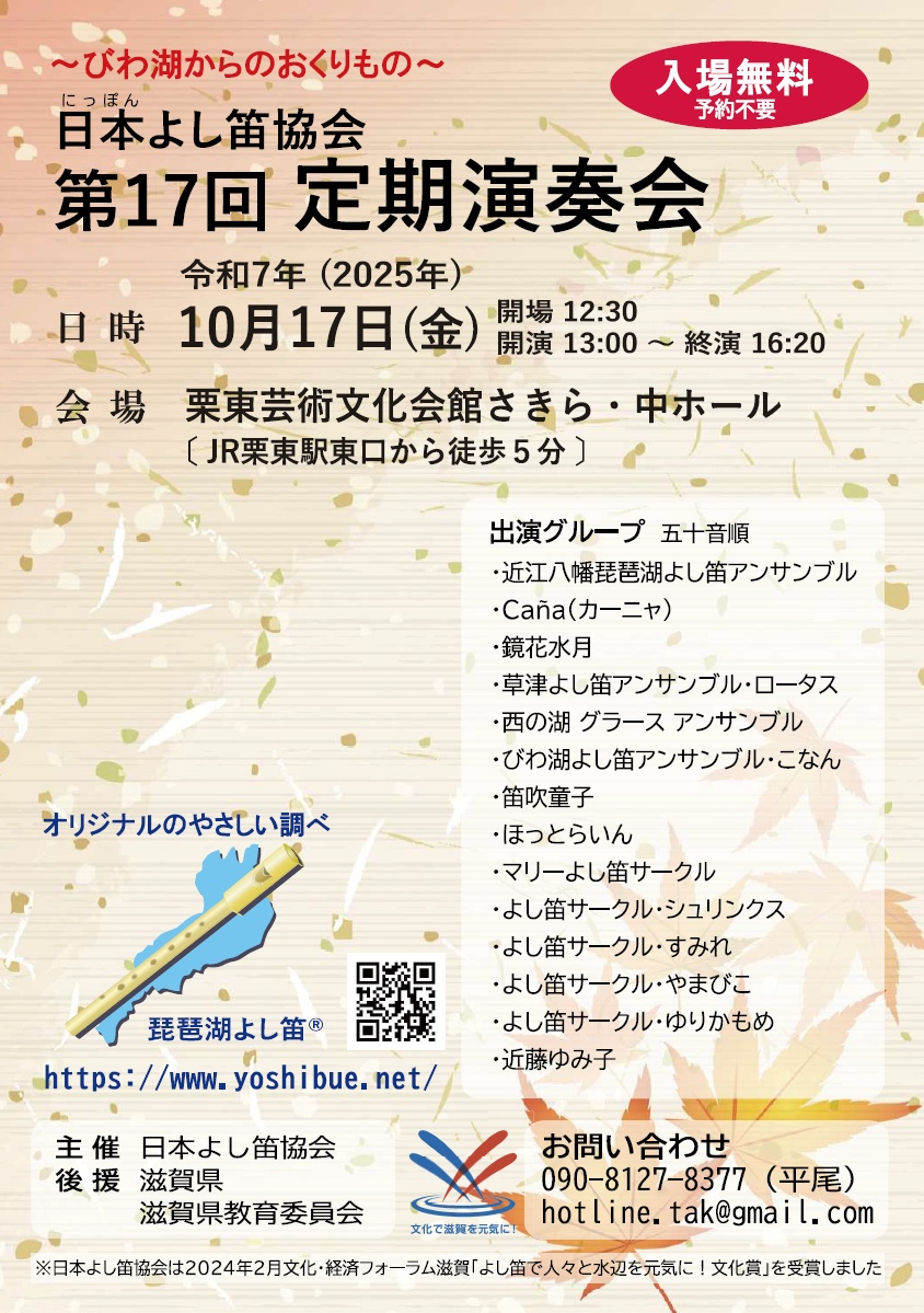 10月25日(土) | 出演:びわ湖よし笛アンサンブル・やす ゲスト:ほっとらいん 会場:野洲市・コミュニティーセンターきたの・大ホール 〔 地図 〕 |