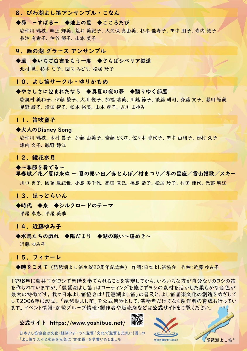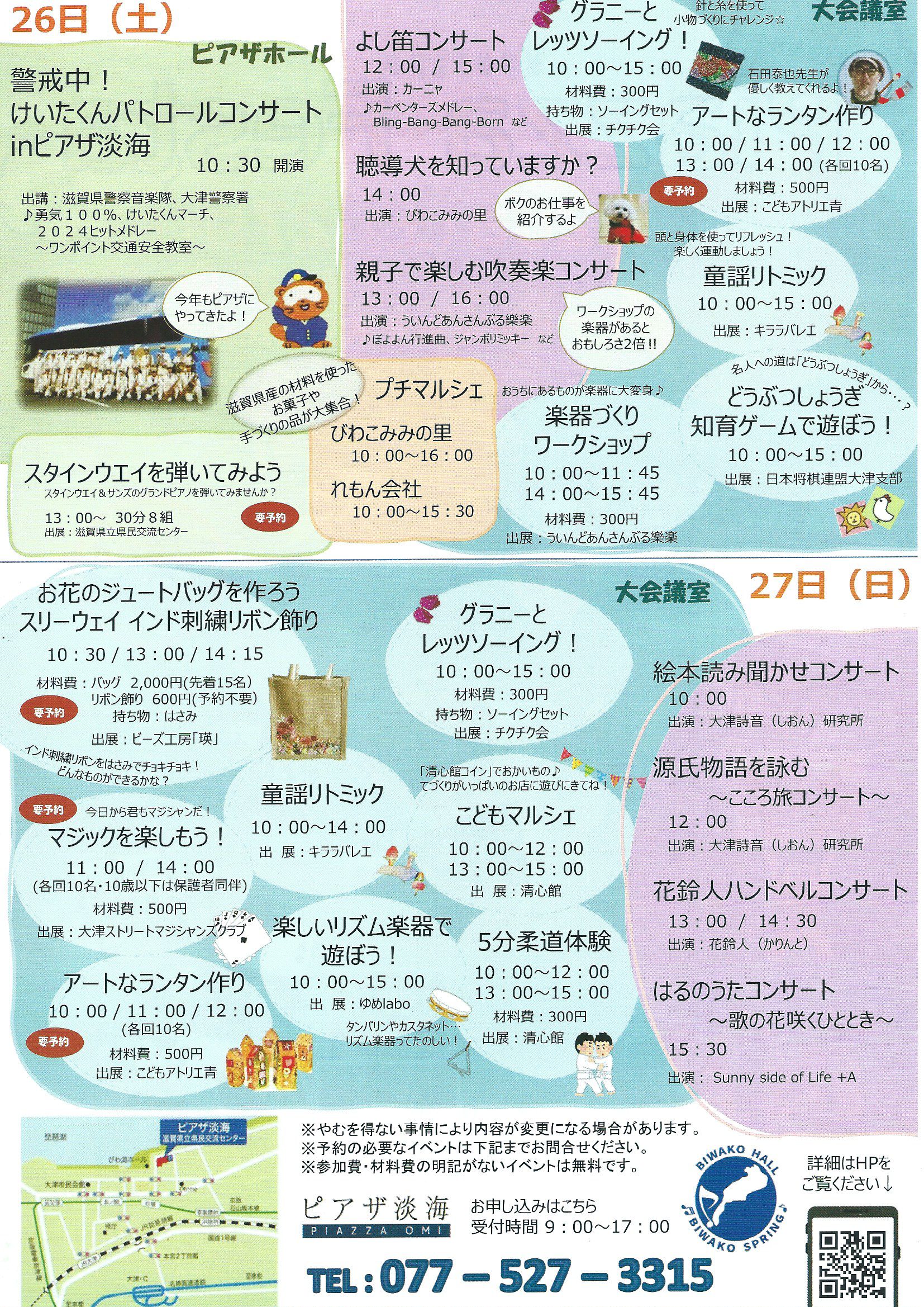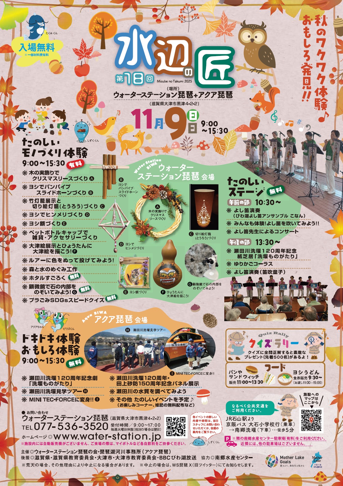 11月9日(日) 9:00-15:30 | 出演(1):びわ湖よし笛アンサンブル・こなん 出演(2):笛吹童子 ※詳細はチラシをご覧ください ※当日は、駐車場はご利用いただけません。車でご来場の際は、会場隣の「南郷水産センター駐車場(有料)」をご利用ください。 ※荒天の場合、その他理由により中止の場合があります。 会場:ウォーターステーション琵琶 〔 地図 〕 [チラシのデータ(PDF)] |