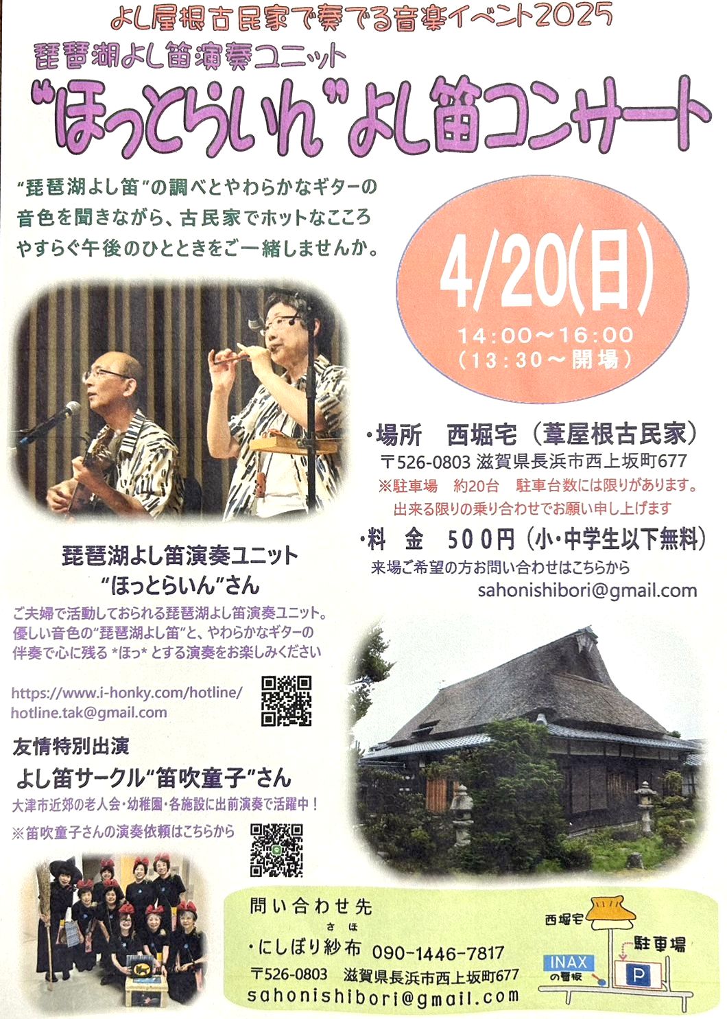 4月20日(日) 14:00〜16:00 | よし屋根古民家で奏でる音楽イベント2025 会場:「北陸自動車道 長浜IC」と「姉川古戦場跡」の間にある古民家(西堀さんち) 〔 地図 〕 笛吹童子も友情特別出演! |