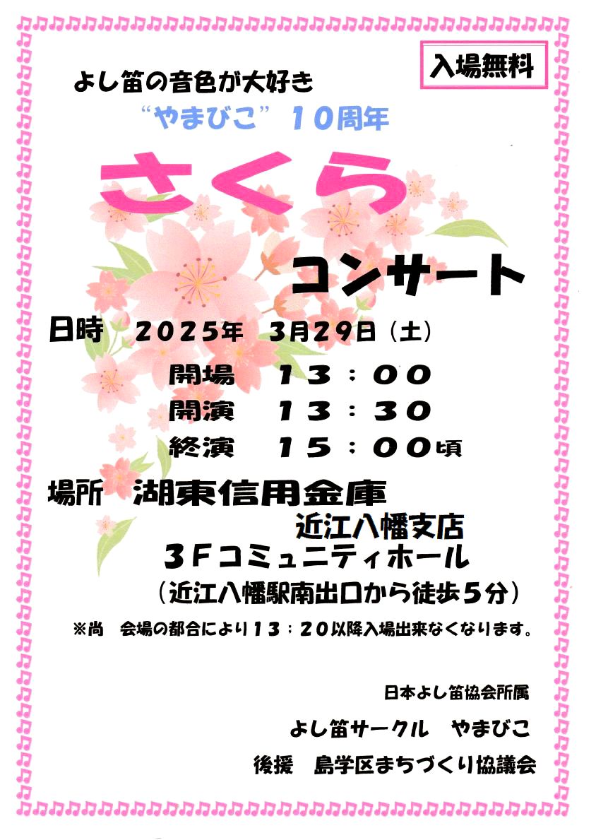 3月29日(土) 13:30〜15:00 | 出演:よし笛サークル・やまびこ 会場:湖東信用金庫 近江八幡支店・3Fコミュニティーホール (近江八幡駅南出口から徒歩5分) ※会場の都合により13:20以降は入場できません 〔 地図 〕 |