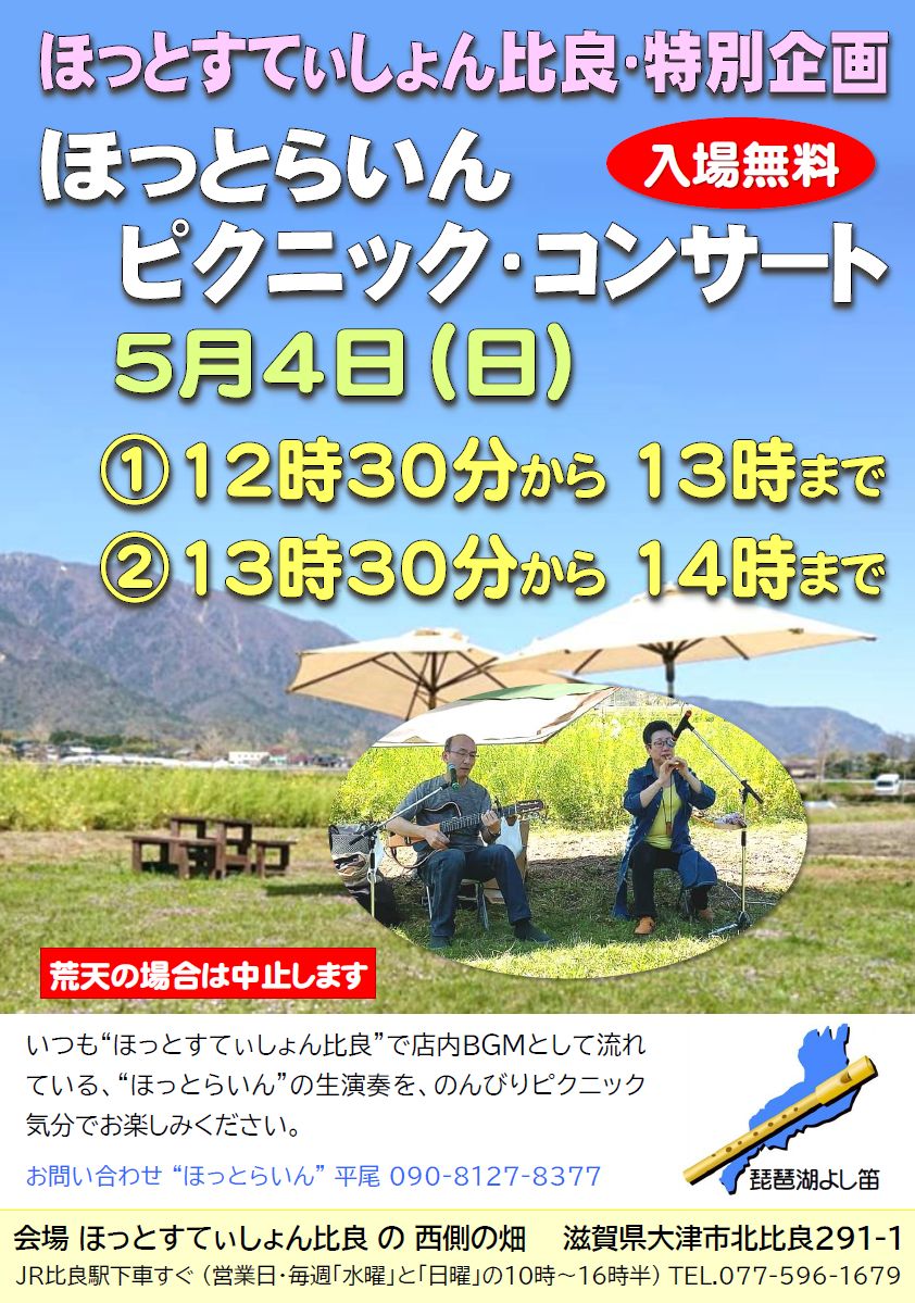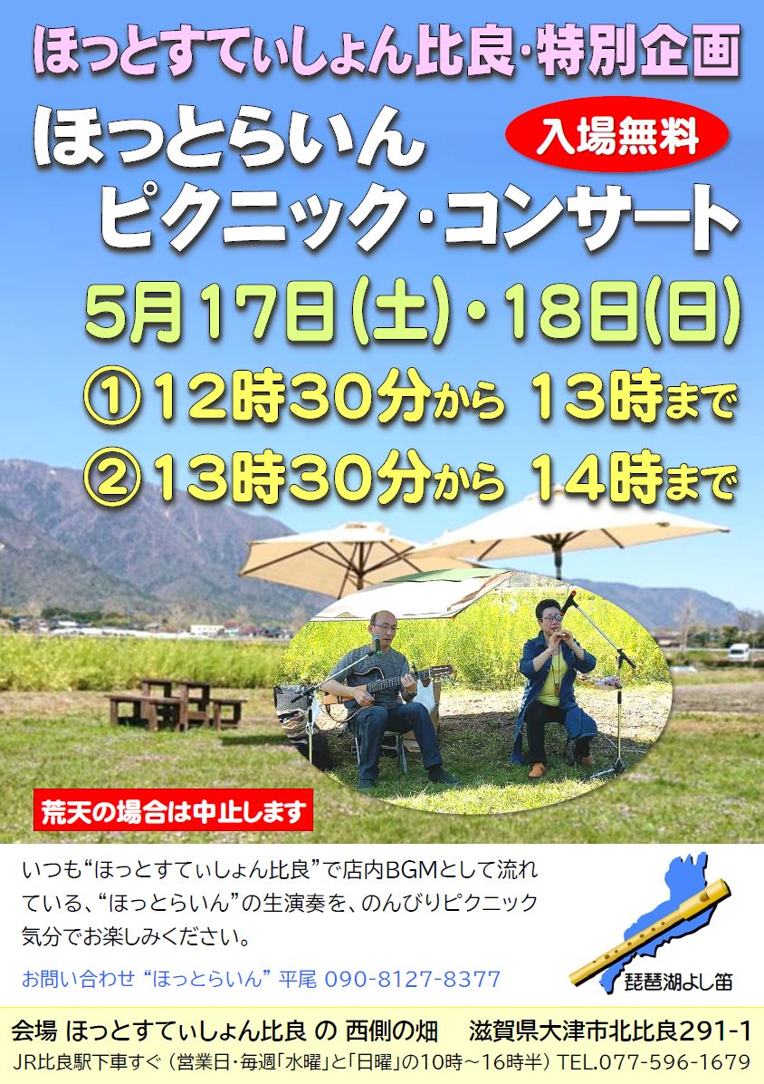 5月18日(日) 12:30〜、13:30〜 | 会場:JR比良駅前・ほっとすてぃしょん比良の西側の畑 〔 地図 〕 比良周辺で開催中のビッグ・イベント「かんじる比良」に来たついでに、お気軽にお立ち寄りください。 ※5月17日(土) は雨予報のためピクニック・コンサートの開催は見送ります |