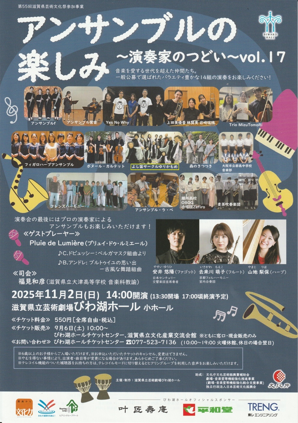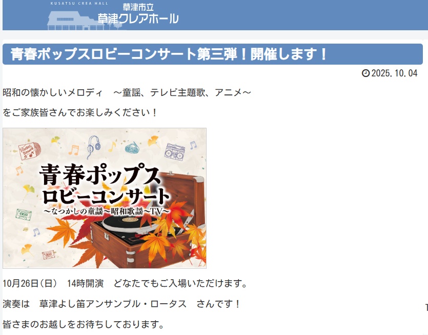 10月26日(日) 14:00〜 | 出演:草津よし笛アンサンブル・ロータス 会場:草津クレアホール 〔 地図 〕 |