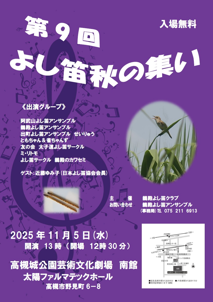 11月5日(水) 13:00- | 会場:高槻城公園芸術文化劇場 南館 〔 地図 〕 ※京都市の鵜殿よし笛クラブさん主催のコンサートに近藤ゆみ子会長がゲスト出演します |
